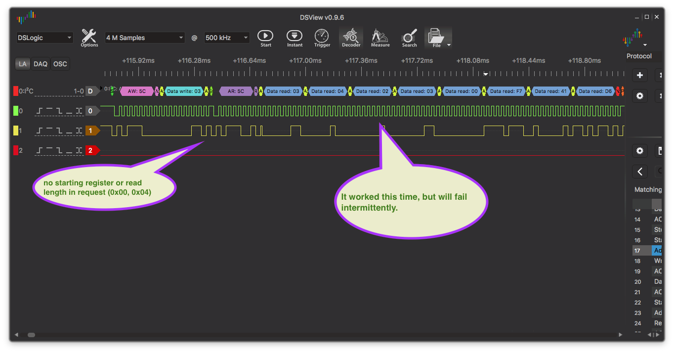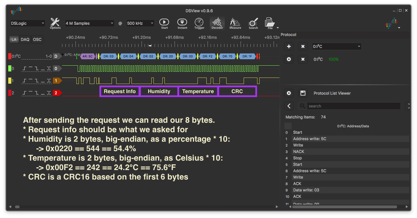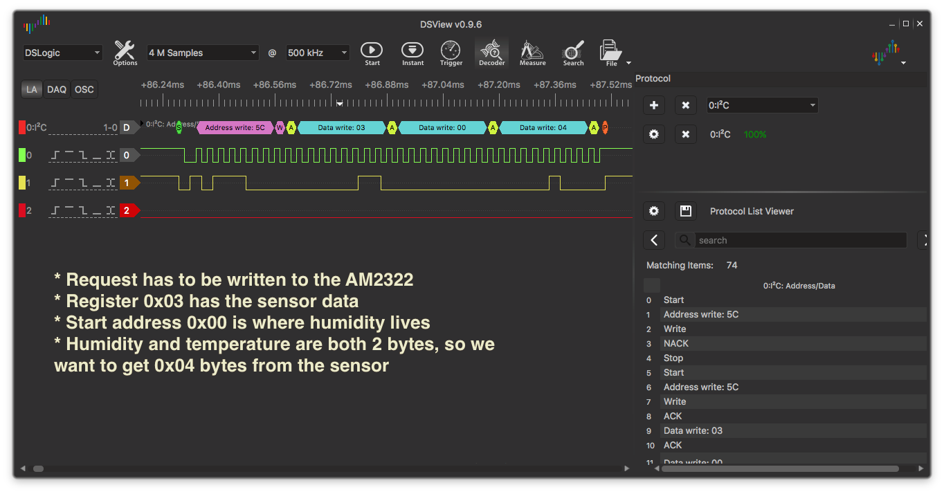 I had to pore over the datasheet (similar to AM2321), look at example code, and finally pull out my logic analyzer to understand the issue. Other people had mentioned that the AM232* sensors aren’t exactly i2c compliant, but never dived into the details of why.